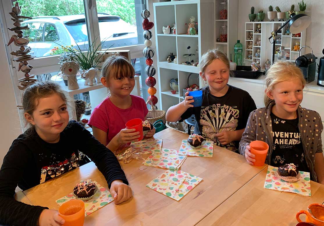 Im September 21 hatten vier Mädchen eine Geburtstagsparty in meinem Atelier. Zu diesem Anlass kreierten wir zusammen vier bunte Glücksdrachen und drehten gemeinsam vier Tassen an der Drehscheibe für den täglichen Gebrauch. Es waren 2.5 vergnügte und fröhliche Stunden!